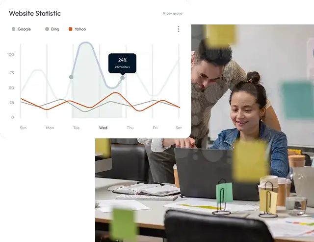 A man and a woman engage with digital devices, displaying weekly data trends and Off-Page SEO.